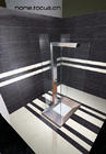 在長方形的衛(wèi)浴空間中,色塊拼貼的瓷磚大面積地鋪貼墻面與地面,延伸了空間感,使整個空間貫通。以狹小的條形、跳躍的色塊來營造明快、簡潔卻富有創(chuàng)意的風(fēng)格。它的鋪貼不受常規(guī)磚的束縛,為點線面的組合提供了可能。