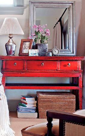 仿舊處理的紅色床頭柜,有滄桑的美感,柜體的設(shè)計(jì)十分簡潔,臺(tái)面上擺放臺(tái)燈和鏡子,下面收納著儲(chǔ)物箱和書籍,在需要時(shí)可以充當(dāng)梳妝臺(tái)和書桌,經(jīng)典實(shí)用。