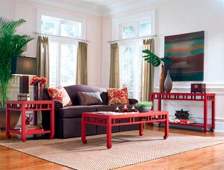 概要: 圖為中國紅扮家居 1。簡潔線條客廳家具 沙發(fā)的舒適感令人難以抗拒,在沙發(fā)周圍布置朱紅色的木質(zhì)茶幾和邊柜,經(jīng)典的中式元素設(shè)計(jì), 讓客廳的風(fēng)格迅速改變,搭配幾個(gè)紅金色花卉剪影圖案的靠包,營造吉祥喜慶的新年氣氛。圖為紅色仿舊床頭柜 2。