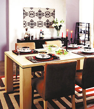 借鑒:由于客廳的用途較多,占用面積也較大,餐廳往往只占其中一隅,設計上必須注意分隔技巧,可從地板著手,將地板的形狀、色彩、圖案、質料分成兩個不同部分,餐廳與客廳以此劃分形成兩個格調迥異的區(qū)域,也可通過色彩和燈光來劃分,在視覺上輕而易舉地造成兩個不同區(qū)域。