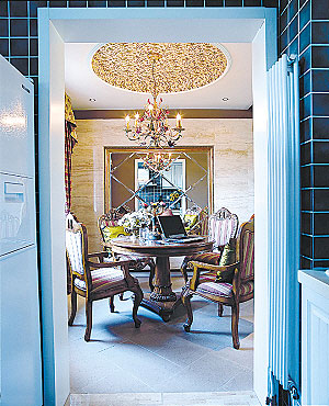 由于整體屬于古典風格,為了提亮整個餐廳的顏色,突出一種溫馨而舒適的環(huán)境,主人采用了大面積的黃色印花壁紙,搭配同款水晶吊燈和壁燈,顯得氣勢很足,也非常適合多人聚餐的環(huán)境。餐廳的另一邊是櫥柜區(qū),適合做一些冷餐及西式餐點,并可承擔起儲物功能,大量的餐具、各種配料、調料都有序地儲存起來。由于和餐廳同處一個空間,更方便了聚餐時的拿取。