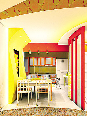 借鑒:由于面積的限制,相當一部分人在設計餐廳時往往把廚房的隔斷墻打掉,做成開放式或用推拉門代替,整體空間相對來說更為開闊。 鮮艷的色彩不會讓就餐變得孤單