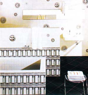 這里圍繞盥洗區(qū)安排了三副圖案,左上有一個鳥籠,下面是一把椅子,右邊是酷似羅馬柱上典型的意大利雕像,三個不相關(guān)的圖案組成一幅耐人尋味的畫面,這種將傳統(tǒng)融會于現(xiàn)代的畫風,與衛(wèi)浴間整體的設(shè)計搭配得天衣無縫。