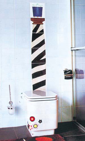 馬桶上方的墻面沒有很多空間可以自由有發(fā)揮,而且還要和馬桶搭配和諧。六片花磚組成的一組圖案,在設(shè)計中加入一些卡通的概念在里面,是使空間變得活潑的一種方法,而且在運用時宜精不宜多。
