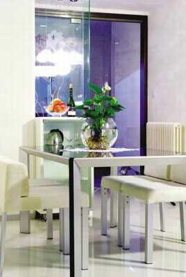 同時,各種玻璃配飾也能為房間增色不少,比如橘色的天鵝燈、優(yōu)雅的巴洛克風格茶幾、海浪形狀的墻飾,所有的一切都將“玻璃”進行到底。