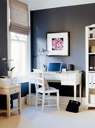 墻面藍灰黑色層次感十足,相框中的紅花與整體色調(diào)形成強烈反差,值得玩味。白色抽屜,椅子,均來自Chic Shack,臺燈頗具質(zhì)感,椅上擱有條紋布藝靠墊。右側(cè)為宜家書架。抽屜左后方Laura Ashley白色小桌上居然又是兩層抽屜的白色小柜,上面隨意擺放一盆小花,給整個房間更添幾分詩情畫意。