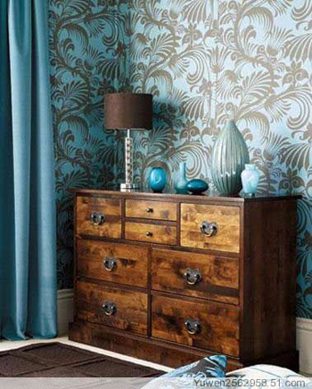 在這里,古樸與張揚和諧共存,泛黃的銅環(huán)抽屜與藍底黑紋墻紙并不突兀。新與舊的家具、墻紙、飾物互相映襯,相得益彰。