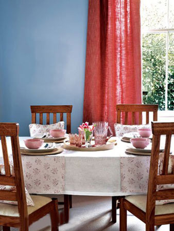 淡藍灰色墻面配以Romo淺紅色窗簾,長條餐桌上鋪以Hemstitch純白桌布,與布藝的木質(zhì)餐椅自然搭配,均來自Laura Ashley。椅上白底粉花的小靠墊與同樣白底粉花的桌旗、餐巾相互輝映。宜家白瓷質(zhì)主菜盤、小盤,以及淡粉色的小碗、淺紅色玻璃杯等無不流露出素雅的回歸。