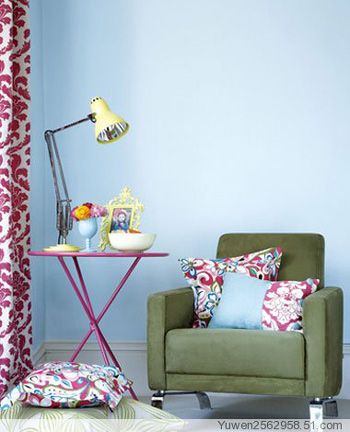 白底淺藍色向日葵圖案的Crowson墻紙賞心悅目。床架和儲藏格均來自宜家,被子和床罩自然也是清新的淡藍色。床頭藍色Lurex小靠墊和Pistachio藍花小靠墊隨意擺放,窗邊小桌上,藍色底座白色燈罩的Marlene臺燈與Matalan花瓶繼續(xù)將藍色進行到底,藍色成為整個房間的主宰,既淡雅又充滿情趣。