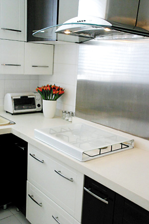 除此之外,還忌夾縫多。廚房是個容易藏污納垢的地方,應盡量使其不要有夾縫。例如,吊柜與天花之間的夾縫就應盡力避免,因天花容易凝聚水蒸汽或油煙漬,柜頂又易積塵垢,這們之間的夾縫日后就會成為日常保潔的難點。水池下邊管道縫隙也不易保潔,應用門封上,里邊還可利用起來放垃圾桶或其它雜物。