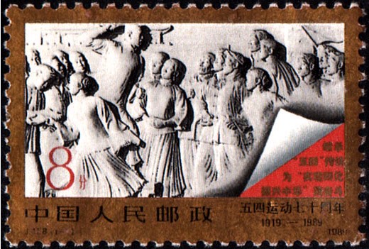 1989年5月4日,我國發(fā)行“紀58”《五四運動七十周年》紀念郵票一套一枚,面值8分,由何潔、李躍義共同設計,圖案為卷起的“五四運動”浮雕。