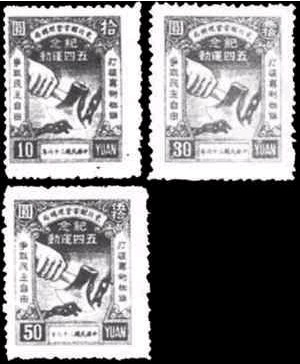 1947年5月4日,解放區(qū)東北郵電管理局發(fā)行紀念五四運動郵票1套3枚,分綠、淡棕、紫色三色,面值分別為10元、30元、50元。主圖為一支巨手持斧砍斷象征專制統(tǒng)治的鎖鏈,兩側空白邊框內(nèi)為兩條標語:“打破專制枷鎖”,“爭取民主自由”。這套郵票的設計者是張修平,他曾參考俄國十月革命后發(fā)行的郵票圖案,巨手握著寶劍砍斷鎖鏈,象征無產(chǎn)階級革命沖毀資本主義枷鎖。