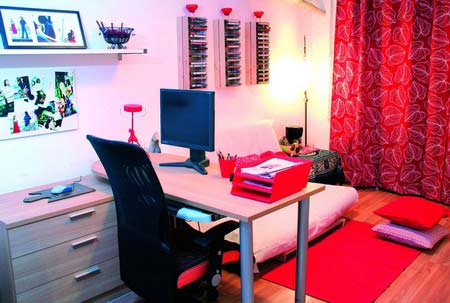 海鮮和小丸子家的廳很小,只能做飯廳使用,朝南的一間十五六平方米的大屋要承擔客廳和書房的作用。原來寫字臺是靠窗擺放的,書架在寫字臺右邊的墻邊;沙發(fā)在寫字臺后,對面是電視機柜,空間顯得擁擠。設計師的妙計是把書桌和沙發(fā)的位置對調(diào),并且把沉重的書架放到寫字臺背后,這個小改變讓客廳的空間變大許多,可以接待更多朋友,沙發(fā)不夠大還可以席地而坐。