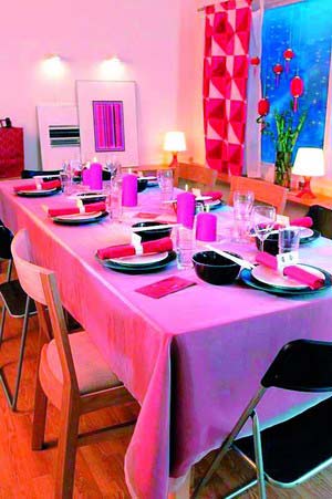 布置餐桌的要領是選擇自己喜歡的餐巾打底,然后用花朵和小飾品來增加情趣。過年當然是紅紅火火最好了,于是兩個人選擇了紅色的小豬餐墊,用漂亮的燭臺、餐巾、杯子、餐巾盒搭配。另外他們的餐桌較小,設計師建議把餐具擺得很緊湊,碗盤都摞了起來,其實碗筷都是家里現(xiàn)成的,換種擺法就有新的味道了。