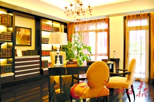 書房考究起來比較有學(xué)問。一般人書房內(nèi)有臺(tái)燈就夠了,因?yàn)榭磿恍枰酂簦侨绻挥信_(tái)燈的話,當(dāng)主人視力疲勞想轉(zhuǎn)移視線時(shí)就會(huì)出現(xiàn)問題,周圍沒有光線供眼睛休息,就容易出現(xiàn)眼花、頭暈的感覺,而這間書房燈飾的設(shè)計(jì)正好考慮到了這一點(diǎn),而且還可以將屋內(nèi)的照片和畫卷照明,讓人倍感溫馨。