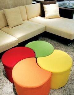梅花墩,體積玲瓏,顏色靚麗,靈活多變,可以將小凳組合,形成梅花造型的休閑沙發(fā),又可以將它們變化角度旋轉(zhuǎn)拼湊,形成漂亮的風車。如果將它們一字排開,就變成一個波浪形的沙發(fā)。