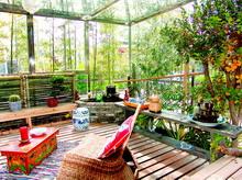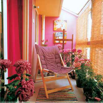 講求雅致的主人或人多房少的家庭,可以考慮將陽臺布置成客廳。在陽臺內(nèi)側(cè)放上沙發(fā)或凳幾,在陽臺兩側(cè)置幾只角架,然后以倒梯形置上花木盆景,不但同樣有迎賓的隆重氛圍,而且不斷可使賓客仿佛置身于戶外,欣賞到別有的一番情趣。