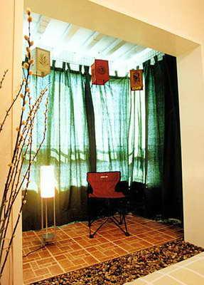 在陽臺外側(cè)裝一鐵架,錯落有致地置上各種盆栽花木;在陽臺內(nèi)側(cè)和扶欄上擺放一些山水盆景;陽臺兩側(cè)可搭架種植幾株牽?;?、長春滕、葡萄等攀滕植物;或在陽臺上鋪黑白的鵝卵石,種上中國蘇州園林中最常見的荷花、翠竹,一個理想中的世外桃源就這樣生成了?;蛘堅O(shè)計師在陽臺上創(chuàng)造了一個“微縮景觀”,并與客廳墻上的中國古典仕女畫相之呼應(yīng)。濃濃的中國情節(jié)籠罩著整個居室,讓每一位來此的人們都感受到自然的生機和活力。令人不出家門就可盡情地享受到大自然的樂趣。