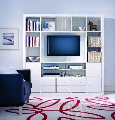 明快的白色擱架呼應(yīng)純白地毯上絢麗的紅色線條,整個(gè)空間顯得輕靈潔凈。作為常規(guī)的整體擱架墻,多格的設(shè)計(jì)及較大的空間務(wù)實(shí)地詮釋著收納的意義。預(yù)留好的位置為電視及影音設(shè)備度身而制,可以很輕松地安排布局。左右對(duì)稱及大小相等的擱架分配,從視覺(jué)效果上使收納效果變得整齊,規(guī)避了物品不同造成的凌亂層次。配套于擱架的收納盒,非常適合放置凌亂的小物品,不浪費(fèi)擱架使用空間,從外表上也做到了協(xié)調(diào)統(tǒng)一,美觀整齊。