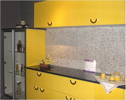 表面材質(zhì)為壓克力,因為看似水晶,所以一般成為水晶門板。防潮性佳且單價不高。使用久了會產(chǎn)生霧化的情形。