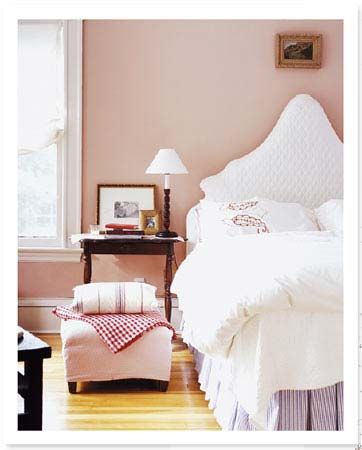 搭配建議:明亮的白色床品對比略帶灰度的粉珍珠色墻體,帶來透氣感。桃紅色沙發(fā)布藝,配以活潑的花卉圖案,使房間局部更為鮮亮。