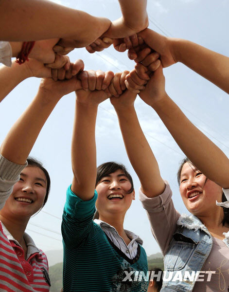 2009年5月11日,楊瑤(中)與同學(xué)在校園里做游戲。