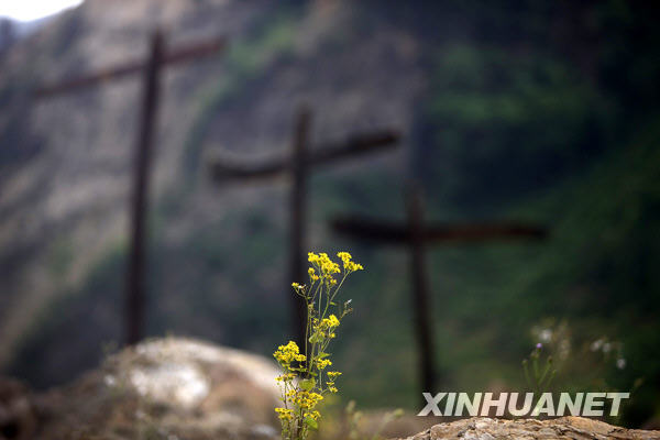 2009年5月11日,在青川縣東河口地震遺址公園,一朵小花頑強(qiáng)地從石頭中長(zhǎng)出來(lái)。