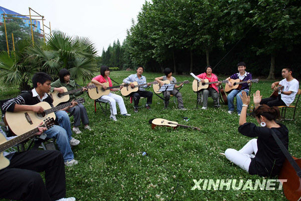 北川中學(xué)的“輪椅樂(lè)隊(duì)”正在校園草坪上排練(2009年5月4日攝)。北川中學(xué)有個(gè)“輪椅樂(lè)隊(duì)”很出名,成員是10個(gè)因地震致殘截肢的學(xué)生。2008年11月溫總理訪(fǎng)問(wèn)北川中學(xué)時(shí),他們?cè)鵀榭偫硌葑唷?/P>