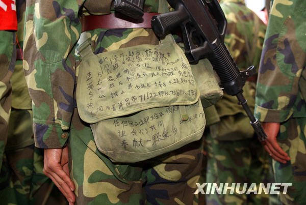 一名戰(zhàn)士的軍挎包上記錄了抗震救災(zāi)的誓言與信念(2008年7月22日攝)。當(dāng)日,參與地震重災(zāi)區(qū)彭州抗震救災(zāi)的1000余名***官兵在成都火車(chē)站登車(chē)撤離,數(shù)千名遭受地震創(chuàng)傷、感受子弟兵關(guān)愛(ài)的災(zāi)區(qū)群眾趕往車(chē)站送別。新華社發(fā)