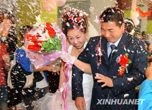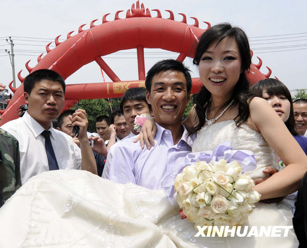 2009年5月12日,陳巖抱著新娘彭露穿過(guò)人群。當(dāng)天,在地震中曾救出29人的志愿者陳巖在四川德陽(yáng)市舉行了婚禮。
