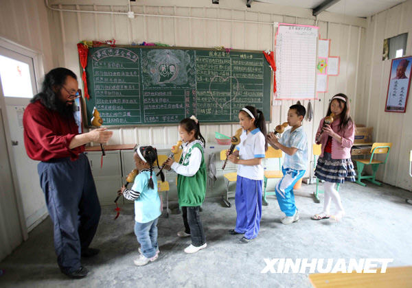 2009年5月1日,王曉春(左一)在指導(dǎo)孩子們進(jìn)行隊(duì)列演奏。王曉春被映秀鎮(zhèn)村民稱(chēng)為“超級(jí)志愿者”,他已年滿(mǎn)60,從2008年10月至今,他已為災(zāi)區(qū)群眾連續(xù)工作了200多個(gè)日夜。他用音樂(lè)的美,為災(zāi)區(qū)的孩子療傷,讓他們重拾信心,找回歡樂(lè)。