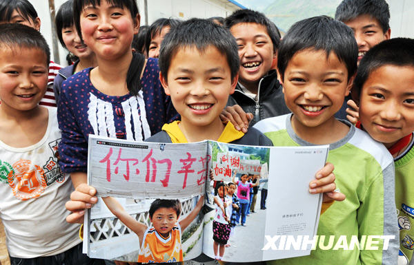 四川青川縣馬鹿小學(xué)的孩子們拿出印有他們照片的畫(huà)冊(cè),請(qǐng)記者為他們留影(2009年4月21日攝)。2008年地震時(shí),他們自發(fā)在公路旁打出自制感恩的標(biāo)語(yǔ)牌,慰問(wèn)援助隊(duì)伍,感動(dòng)了無(wú)數(shù)人。