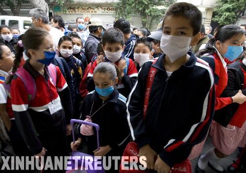 5月11日,在墨西哥首都墨西哥城,一些戴著口罩的小學(xué)生準備進入學(xué)校上課。當(dāng)日,因受到甲型H1N1流感疫情影響停課的墨西哥中小學(xué)和學(xué)齡前教育機構(gòu)開始復(fù)課。 新華社/路透