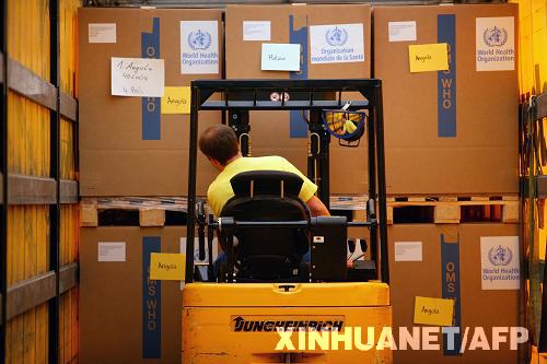 世界衛(wèi)生組織提供的照片顯示,5月5日,工作人員在瑞士羅氏公司在凱澤勞斯特的配送中心搬運(yùn)藥品。羅氏公司12日宣布向世衛(wèi)組織捐贈(zèng)總共565萬(wàn)個(gè)療程的抗病毒藥“達(dá)菲”,以幫助應(yīng)對(duì)當(dāng)前的甲型H1N1流感疫情以及可能由此引發(fā)的流感大流行。 新華社/法新