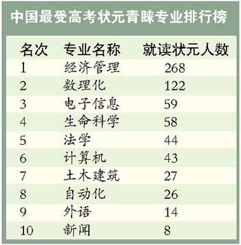 而1999年以來的高考狀元明顯集中于熱門專業(yè),如經(jīng)濟管理、生命科學(xué)、電子信息、法學(xué)和計算機等專業(yè)。2008年,全國有近七成高考狀元選擇就讀經(jīng)濟管理專業(yè)。