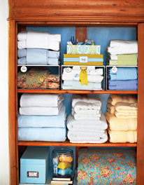 一個置物架就可把毛巾、床單等家紡用品盡收“腹”內(nèi)。首先要把毛巾類和床單、被罩類分開存放。毛巾可以按顏色分摞疊好,床單則可以按尺寸疊成方塊,將枕套縱向疊成條狀圍在床單上,再根據(jù)不同的使用季節(jié)打上標簽區(qū)分。