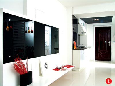 ★用?;u、烤漆玻璃增強反光效果。廚房、衛(wèi)生間的墻面用?;u比亞光磚反射效果更好,視覺上使空間變大。設計師利用這個原理用黑色烤漆玻璃做電視背景墻。局部黑色及烤漆的反光都會使空間變大。