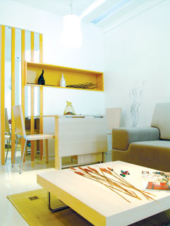在完全敞開的小戶型空間里如何區(qū)隔睡覺、休閑、洗浴、就餐、做飯等功能?理想狀態(tài)是沒有視覺障礙,整個空間連成一體同時又各有分工。