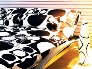 ★巧用墻面造型。圓系列樣板間客廳和臥室之間用簡單的背景墻造型就區(qū)隔了空間,黑白相間的圓形和居室風格協(xié)調(diào),造價也低,一張石膏板足夠用,裝飾效果也很好。