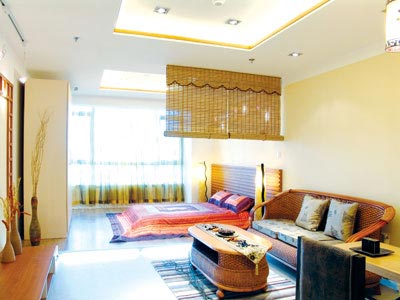 ★用橫條紋的造型或配飾延展視覺空間。這七套樣板間都注重使用橫條紋這個增大視覺空間的手段。楓木系列樣板間客廳和臥室棚頂?shù)臋M條紋造型,粉色系列樣板間的橫條紋隔斷,以及韓式空間、圓系列樣板間的橫條紋百葉簾等都起到這個作用。