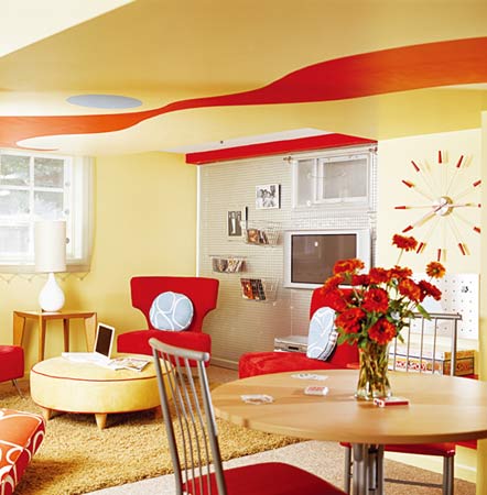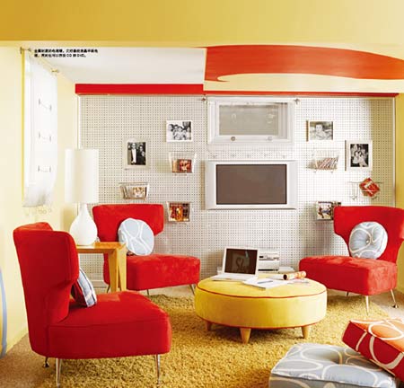 個(gè)沒有陽(yáng)光的房間更顯溫暖,天花板的邊際是紅色的波紋,活躍而動(dòng)感,非常符合視聽間的時(shí)尚氛圍。