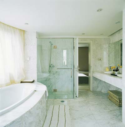 灰白紋理的大理石鋪砌的浴室,無須過多的裝飾,清新淡雅。