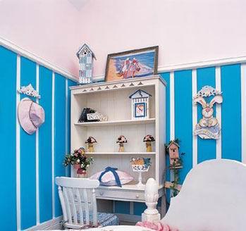 兒童房的裝飾重點應(yīng)該是表現(xiàn)孩子的天真活潑,在藍白相間的條紋墻裙上加入柔美的粉紅色,整個房間立刻變得溫馨可愛。床上用品、桌布和窗簾的各個細節(jié)搭配與墻面的顏色非常統(tǒng)一,更讓這小小的空間成為一絲不茍的完美境界。
