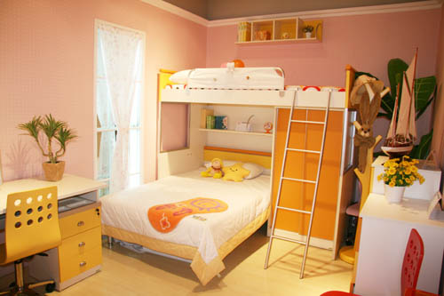 為了適應(yīng)孩子的成長(zhǎng)特點(diǎn)和身體健康,兒童家具往往被設(shè)計(jì)成可以自由組合,而且靈活多變。如兒童桌椅,為適應(yīng)孩童迅速長(zhǎng)高的身體變化,桌子可以調(diào)整高低,桌面也可以調(diào)整傾斜的角度,按照相關(guān)原理設(shè)計(jì),預(yù)防近視、駝背、減輕孩子的學(xué)習(xí)疲勞。而為了在有限的空間內(nèi)解決孩子的學(xué)習(xí)、娛樂、休息等生活需要,一般床都可以組合成高低床、L形床,電腦桌、衣柜、書桌等都可以巧妙地拼裝在一起??臻g被充分利用起來。如記者看到的某款組合:高架床,床旁邊是一個(gè)小扶梯,扶梯臺(tái)階由幾個(gè)抽屜拼成,抽屜可以儲(chǔ)放衣物。床下面是一個(gè)轉(zhuǎn)角電腦學(xué)習(xí)桌,可以放置一臺(tái)電腦,又可以當(dāng)書桌使用。在電腦桌旁還放有一個(gè)小衣柜,可以放置一些常用衣物。另一轉(zhuǎn)角處有一個(gè)文件柜,可以放學(xué)習(xí)資料和書籍。電腦桌被分隔成二層,底下的一層還可以放小物件、書籍等。大約兩平方米的空間就這樣被充分利用起來了。