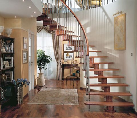 螺旋向上式樓梯。這種樓梯優(yōu)點(diǎn)在于具有強(qiáng)烈的動(dòng)態(tài)美,多在廳堂偏中部位旱地拔蔥。由于不靠墻,圍欄不能借助墻體,需加上透空欄桿,這就更好地表現(xiàn)了樓梯的藝術(shù)之魅。但這種樓梯由于每一段跨度較多,因此安全性較差。有老人和學(xué)齡前兒童的家庭,建議慎重使用。
