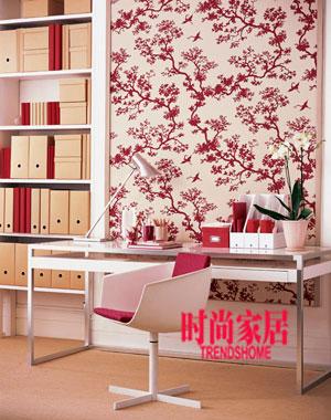 墻面上絢麗的玫瑰紅花草,與書(shū)房里點(diǎn)綴的玫瑰紅色的文具,為家庭辦公環(huán)境創(chuàng)造出一個(gè)明媚的亮點(diǎn)。