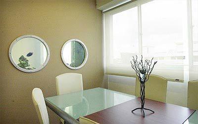 面向飯廳的那道墻上,設(shè)計師特地以兩個圓圈玻璃勾畫魚缸,宛如在船上透視海底世界,別有一番情趣。