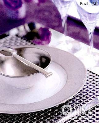 9.布置一張令人愉悅的餐桌,餐具和餐墊等細(xì)節(jié)也不能忽視。鍍銀餐墊十分特別,突破常規(guī)的材質(zhì),讓它當(dāng)仁不讓成為餐桌焦點,同時,餐碗內(nèi)壁鍍銀裝飾和餐勺、叉子所用的材質(zhì)也形成呼應(yīng)。這種餐墊在Christofle有售,相比較一般的餐墊,金屬餐墊不易磨損,也更個性化,但售價要貴一些。