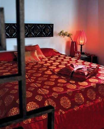 臥室:**燃燒 這里既是整個婚禮過程的終止,又是真正新生活的開篇。既是點燃**的伊甸園,又是消除疲憊的安樂窩。所以,在這再多的紅色、再多的喜字都不為過,因為這里是“真正”屬于你們享用的“紅色禁區(qū)”。但請注意:不管你們想要自己的洞房多么的喜慶或**,墻壁的顏色盡量不要涂成紅色、粉色,房子畢竟是過長久日子的地方。所以,盡量在織物、擺設(shè)的挑選上,多下功夫,從而方便隨時改換臥室的氣氛。 “錦繡桌幃,茶酒饌肴”,使這中式的洞房更多了幾分意境,添了幾縷深情……