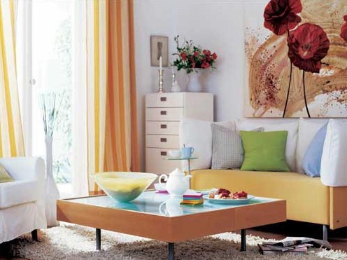東向客廳宜選用黃色作為主色調(diào),顏色深淺的選擇,則由屋主根據(jù)自己的喜好來(lái)定,黃色于東方,有招財(cái)?shù)男Ч?